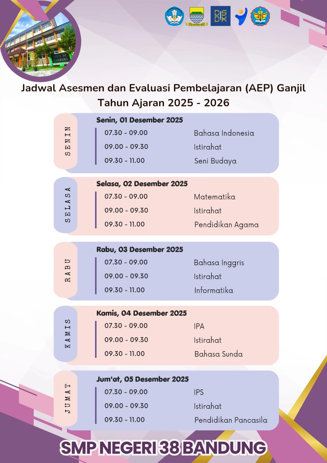 🏫 SMP Negeri 38 Bandung adalah salah satu sekolah menengah pertama unggulan di Kota Bandung yang berkomitmen untuk memberikan pendidikan berkualitas bagi para peserta didik. Sejak berdiri pada tahun 1986, sekolah ini telah berkembang menjadi lembaga pendidikan yang menanamkan nilai akademik, karakter, dan keterampilan abad ke-21.